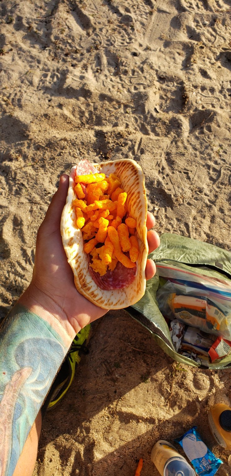 Tonight’s dinner plans are, a white pita bread, salami, cheddar cheese, mayo and honey mustard topped with a dash of Cheetos.
